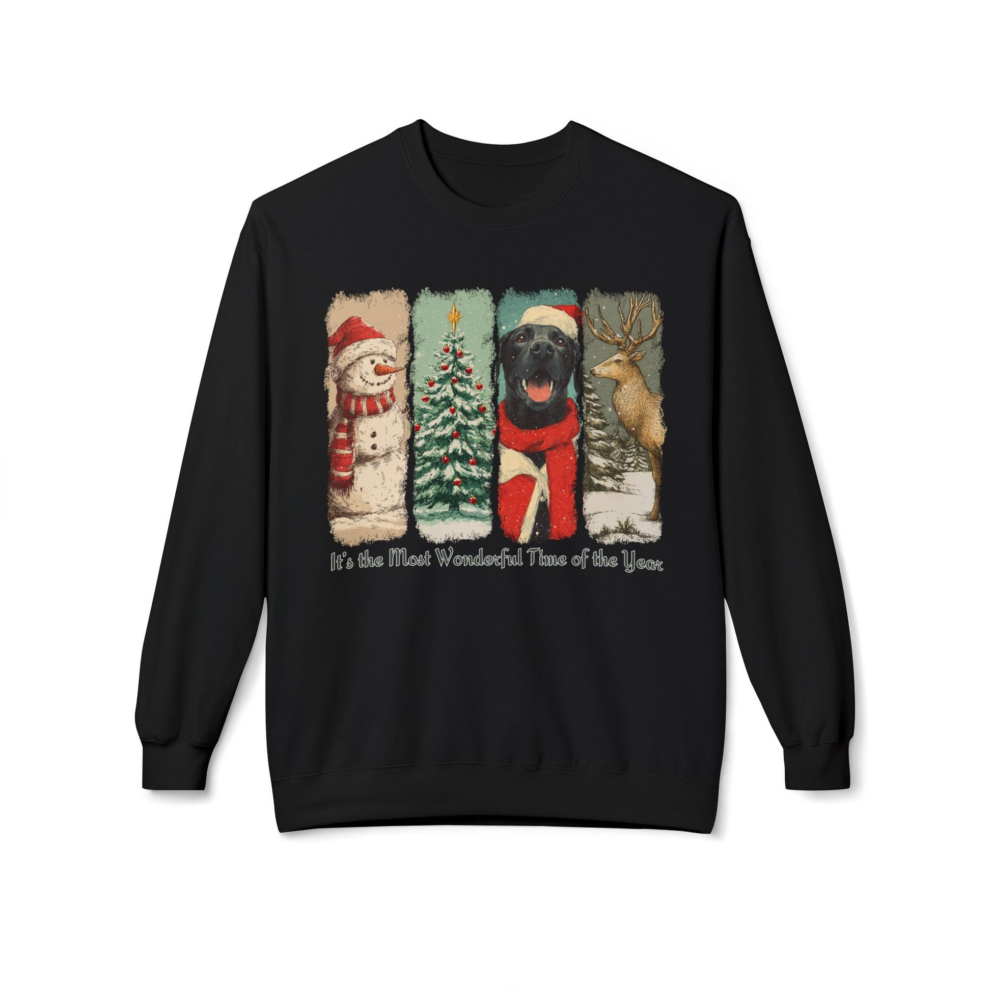 Vintage-inspired Black Labrador Santa Christmas sweatshirt. Made with ultra-soft fleece and a modern, flattering fit, this cozy crewneck is perfect for festive nights, family gatherings, or gifting.