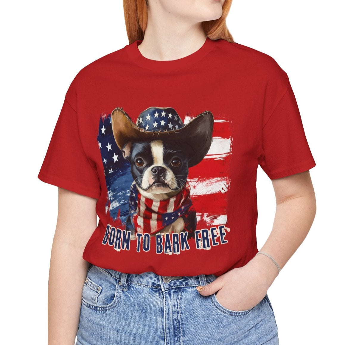 Boston Terrier Patriotic T-Shirt "Born to Bark Free" - Dog-Themed Patriotic Design