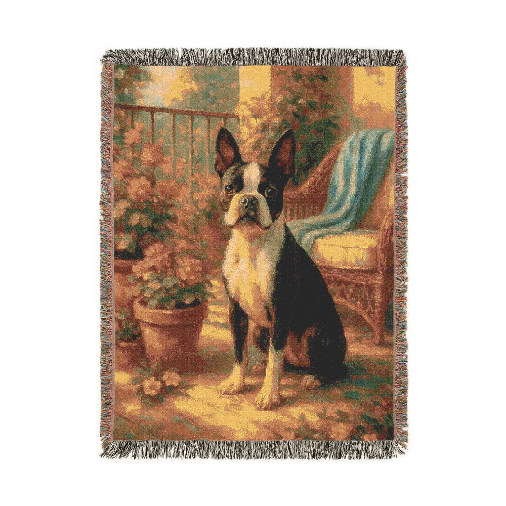 Wrap yourself in the warmth of sunshine and fluff with this charming Boston Terrier sitting on a sunlit urban balcony woven blanket. All captured in a painterly style designed to look amazing on woven textures.
