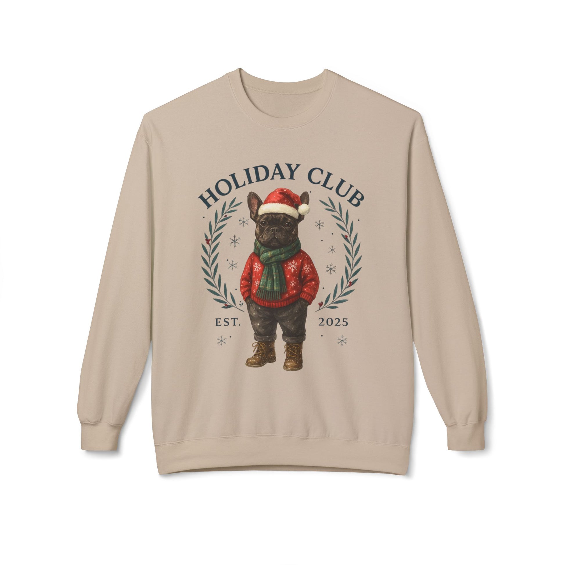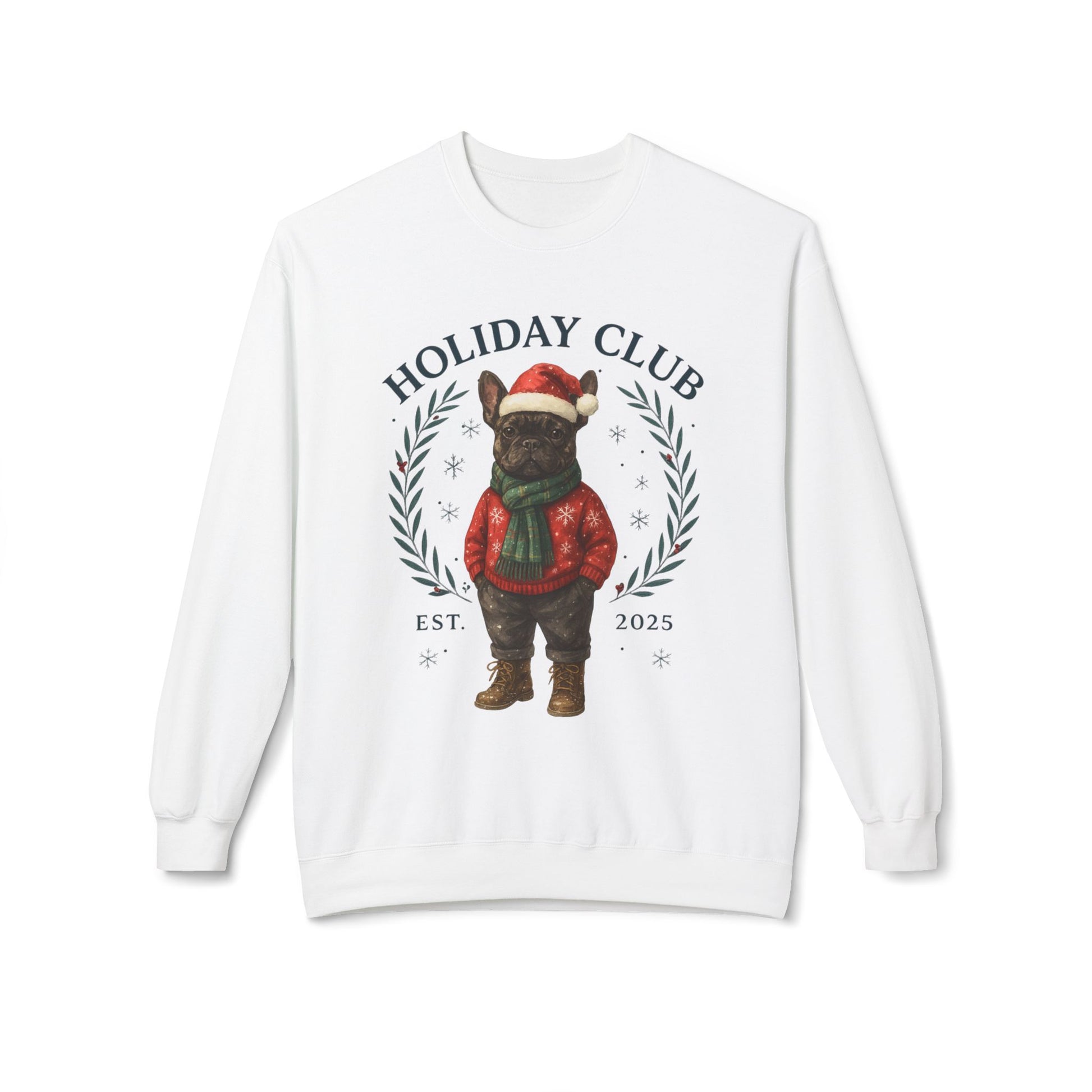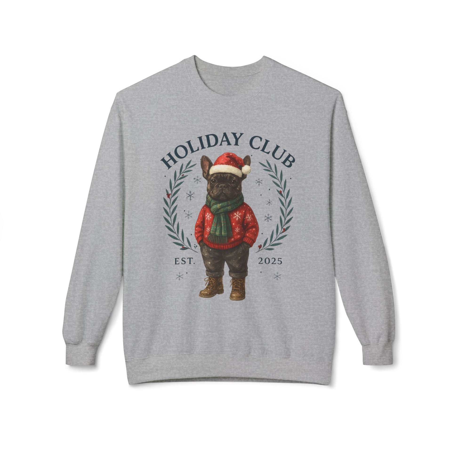 Festive Dog Lover Sweatshirt – Cozy Unisex Crewneck for the Holidays in chic style. Frenchie in a festive outfit, this cozy unisex crewneck blends holiday cheer with boutique fashion, making it the perfect gift for Frenchie lovers or a festive treat for yourself.