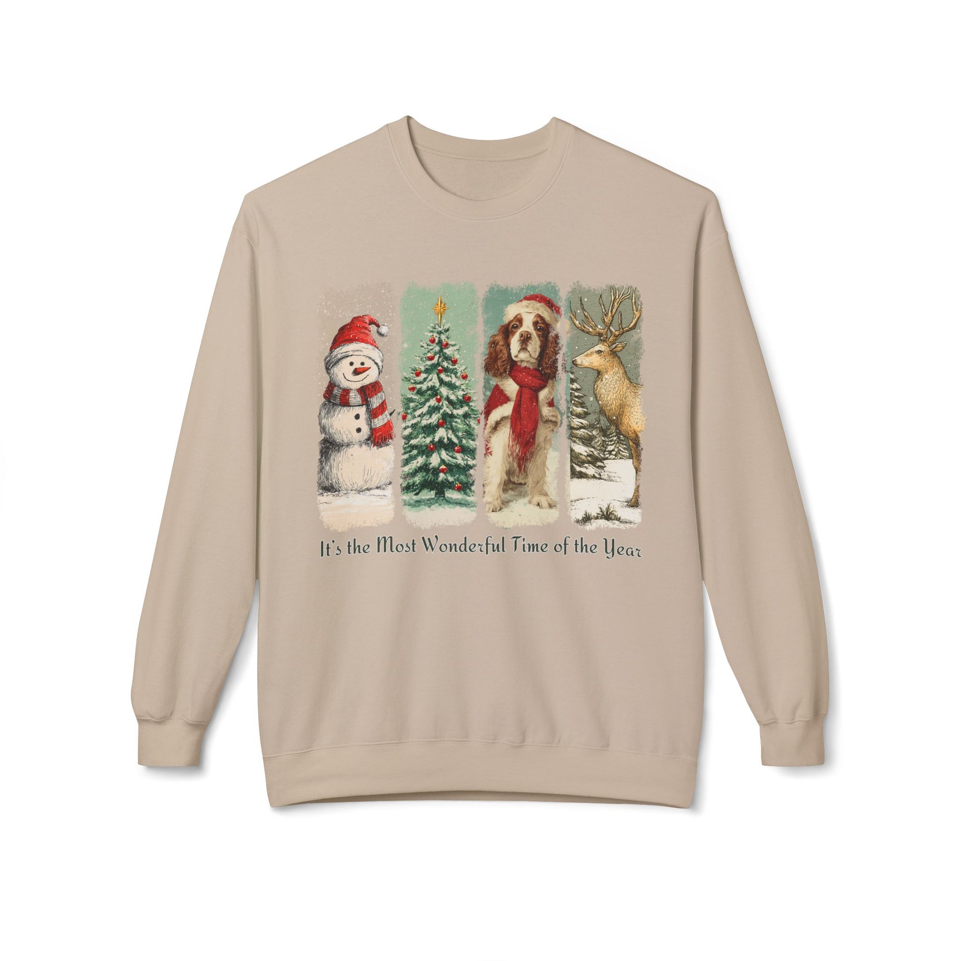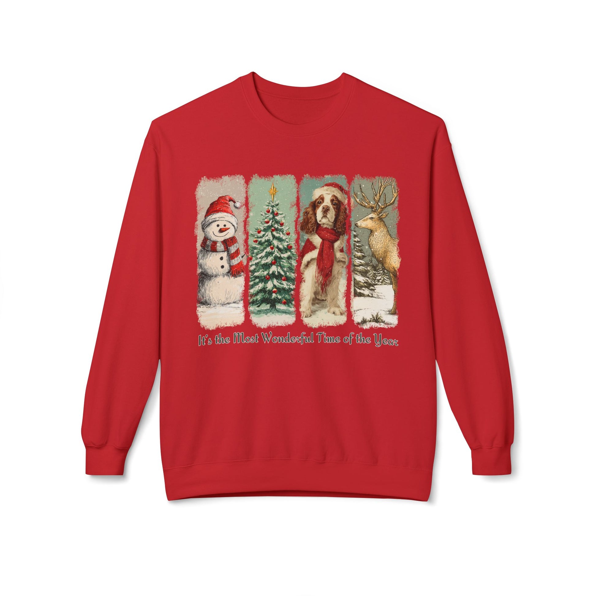 Vintage-inspired Cocker Spaniel Santa Christmas sweatshirt. Made with ultra-soft fleece and a modern, flattering fit, this cozy crewneck is perfect for festive nights, family gatherings, or gifting.