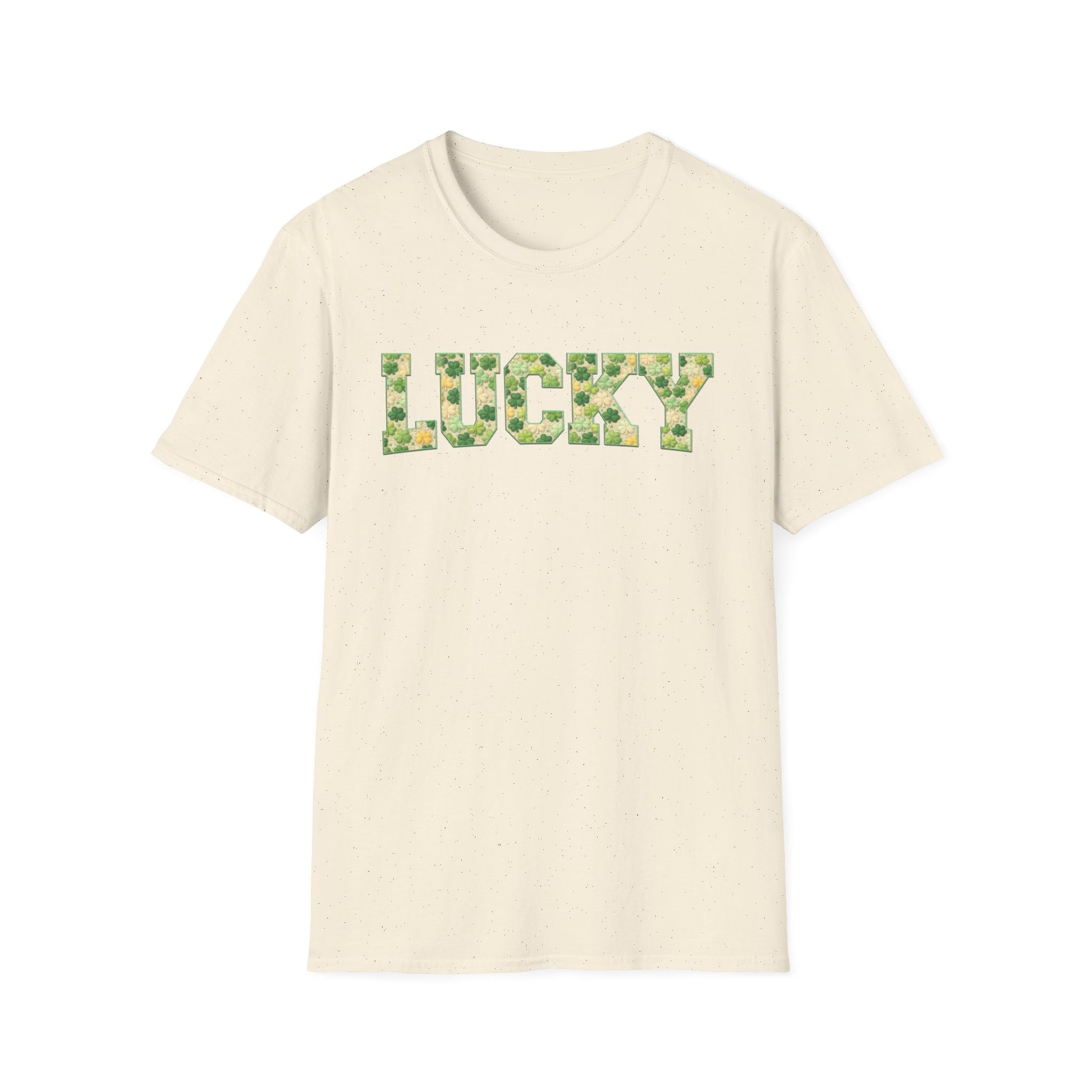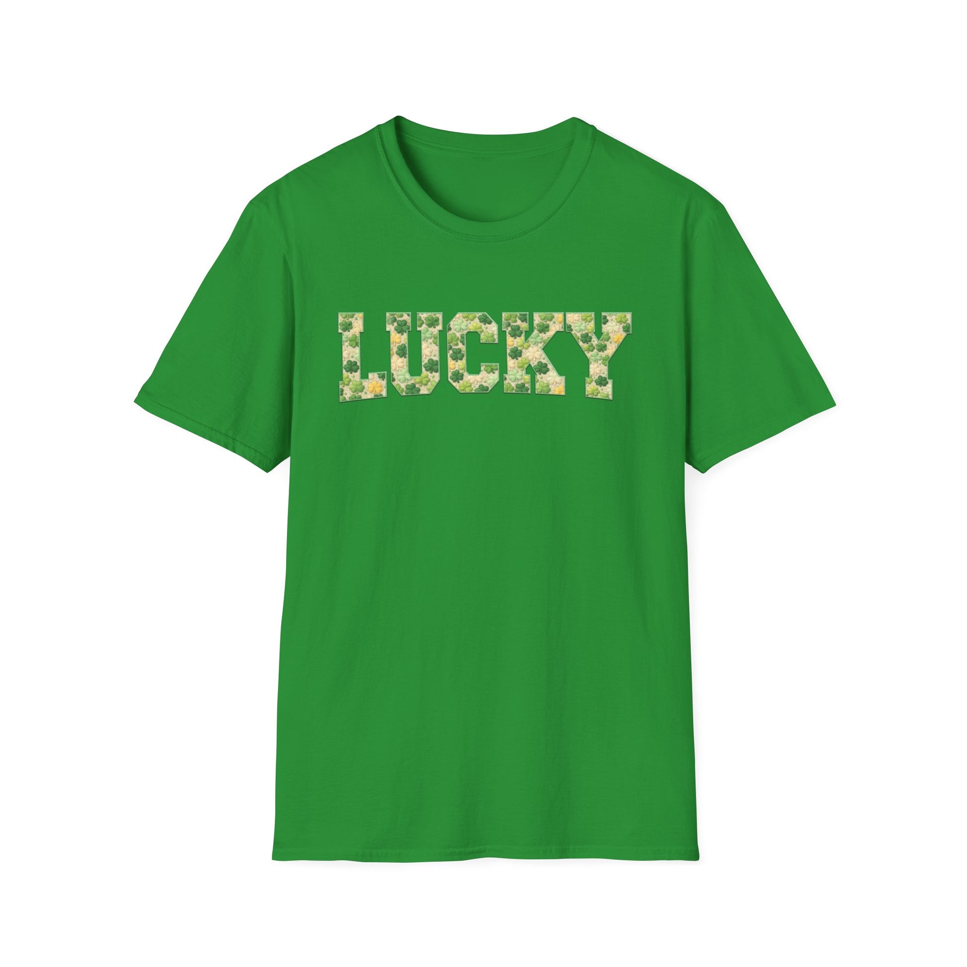 This St. Patrick’s Day t-shirt features a bold LUCKY design with a faux embroidered appliqué look, filled with soft shamrock details for a cozy, textured appearance. Printed on a comfortable unisex tee, it’s perfect for celebrating, gifting, or everyday wear.