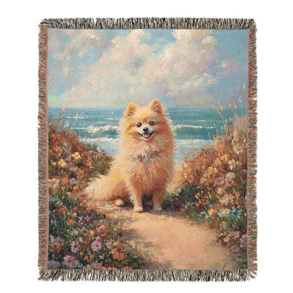 Pomeranian by the Seaside – Woven Blanket - Floral Dog Design for Home Comfort - Customization available