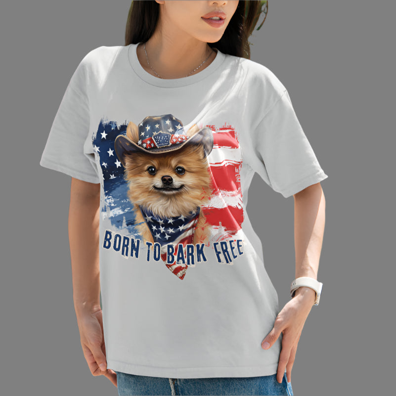 Pomeranian Patriotic T-Shirt "Born to Bark Free" - Dog-Themed Patriotic Design