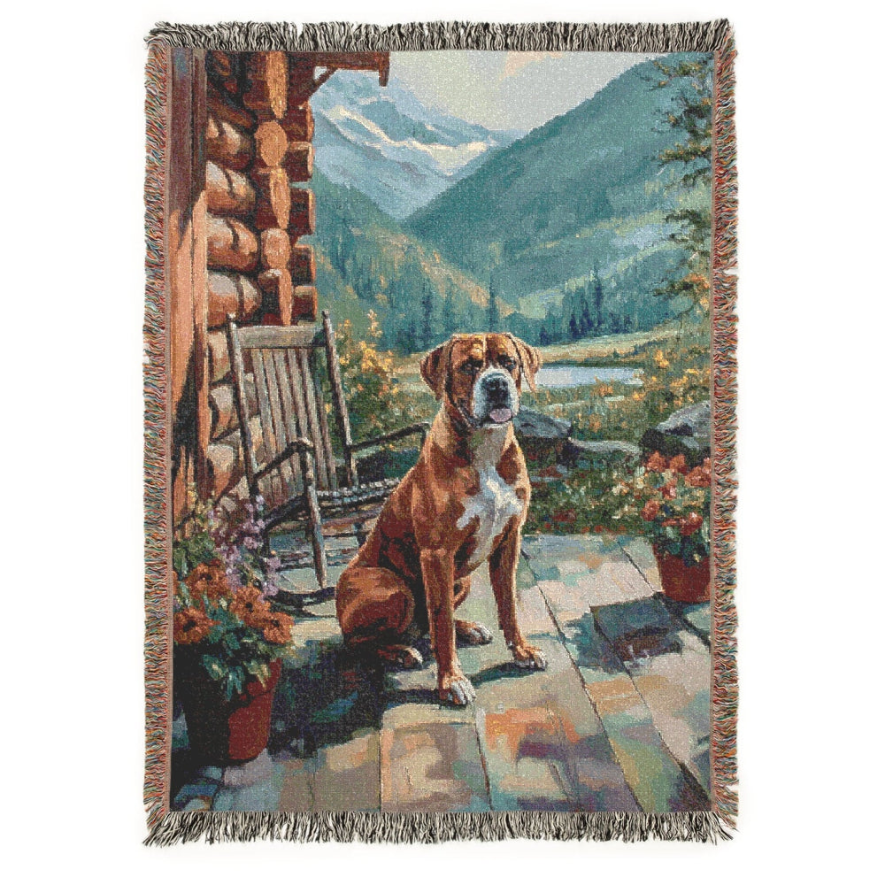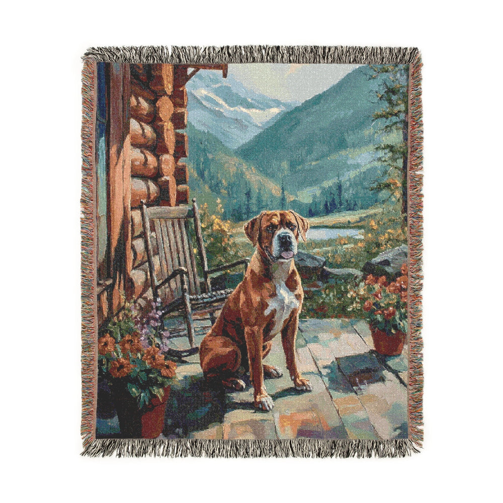 Rustic Porch Scene with Boxer – Woven Blanket - Floral Dog Design for Home Comfort - Customization available