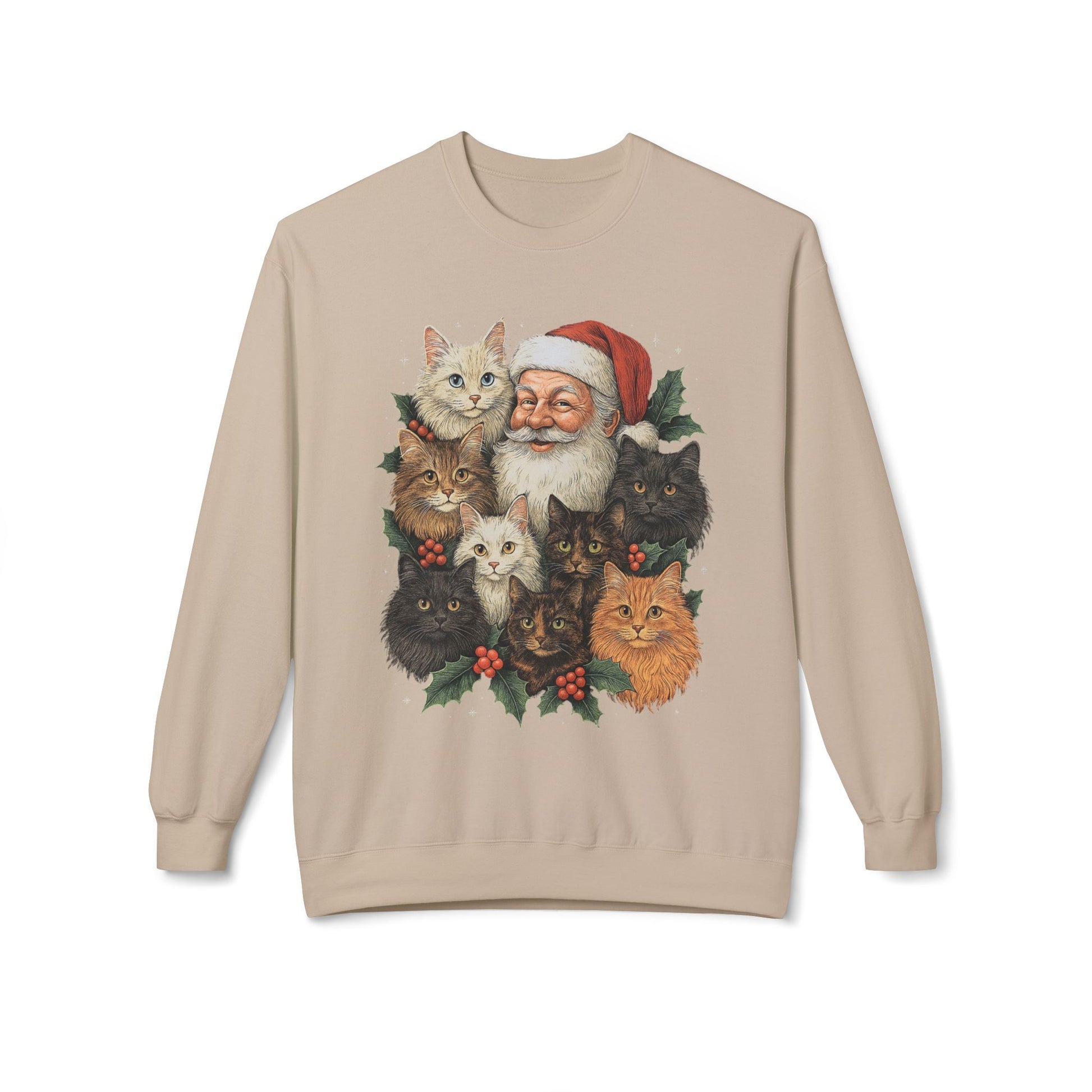 Vintage-inspired Santa & His Fluffy Cats Christmas Sweatshirt. Made with ultra-soft fleece and a modern, flattering fit, this cozy crewneck is perfect for festive nights, family gatherings, or gifting.